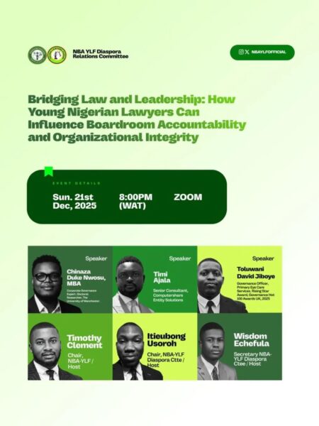 The NBA-YLF Diaspora Relations Committee continues to expand opportunities for young Nigerian lawyers to engage meaningfully with the intersections of law, leadership, and corporate governance.