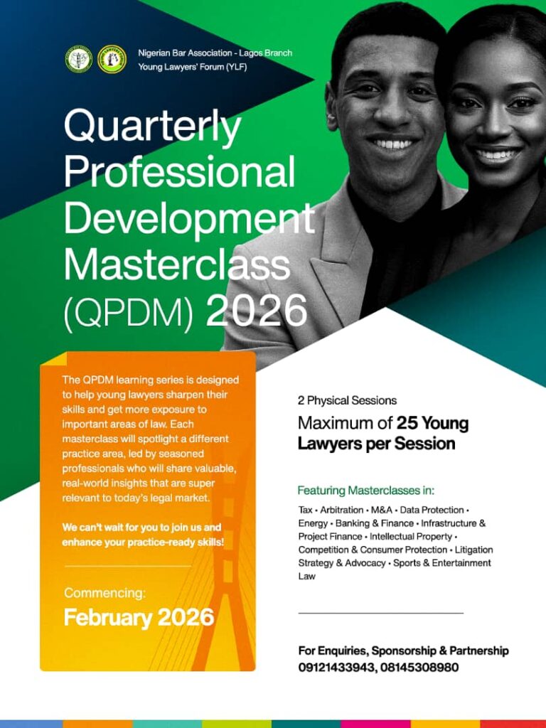 The NBA Lagos Branch, Young Lawyers Forum, is pleased to launch the Young Lawyers’ Quarterly Development Masterclass, an initiative designed to promote the all-round development of young lawyers in furtherance of the NBA Lagos Branch’s vision of building a Bar Without Barriers.